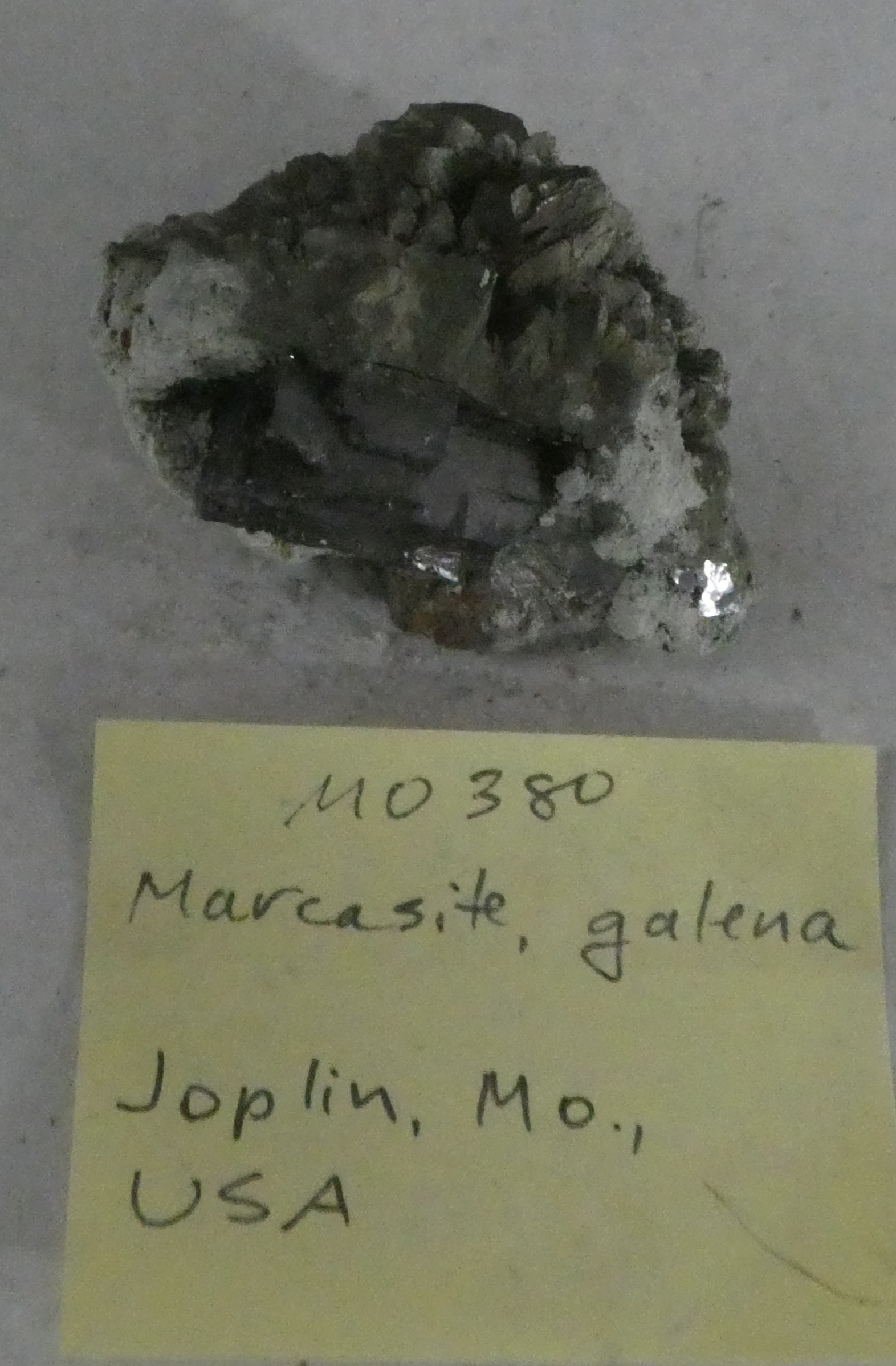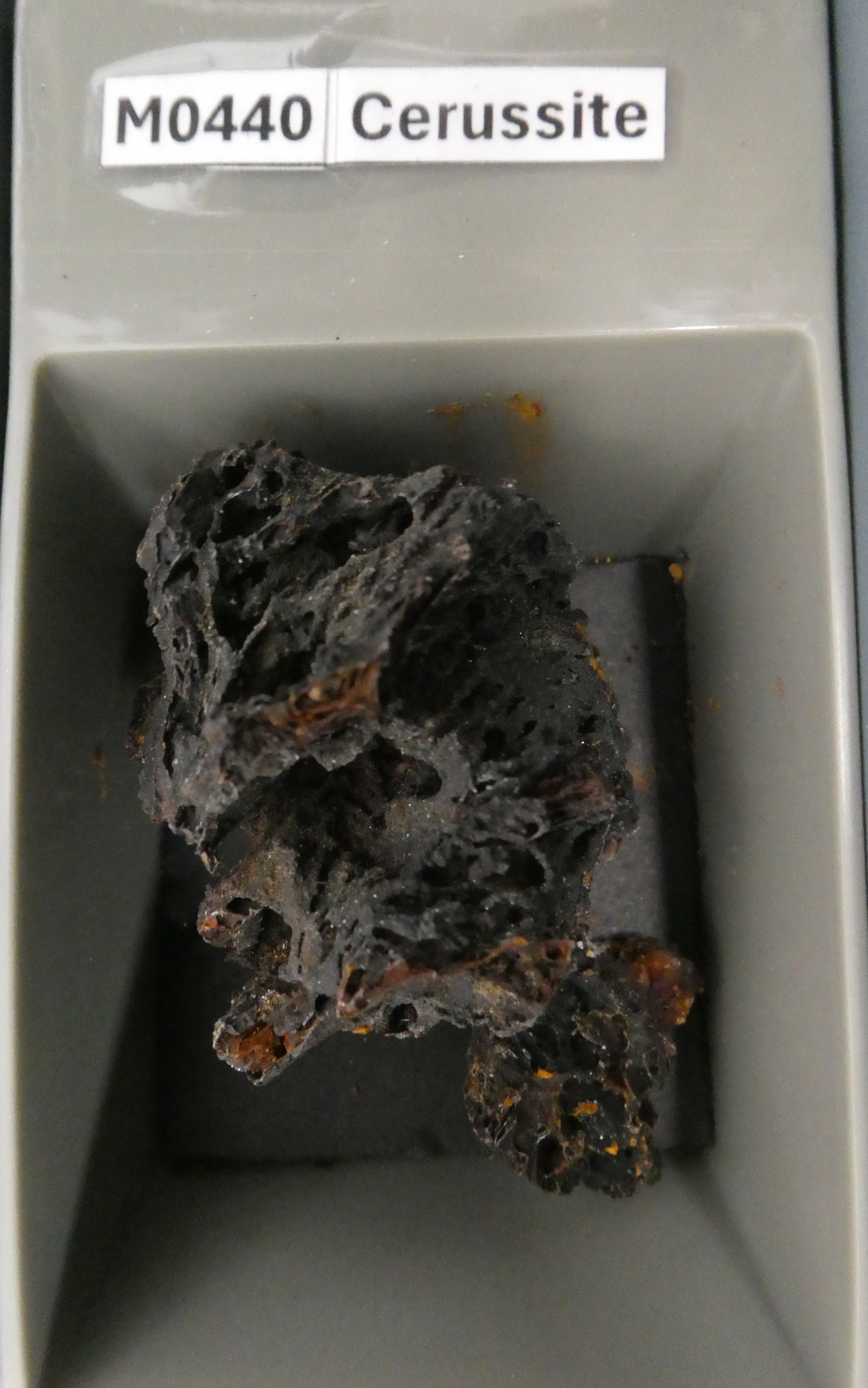Image of Phosgenite, Anglesite, Bornite, Calcite, Chalcocite (var. low), Chalcocite (var. high) and Djurleite in specimen 'M0297 Phosgenite / Djurleite / Anglesite' [CSIRO].