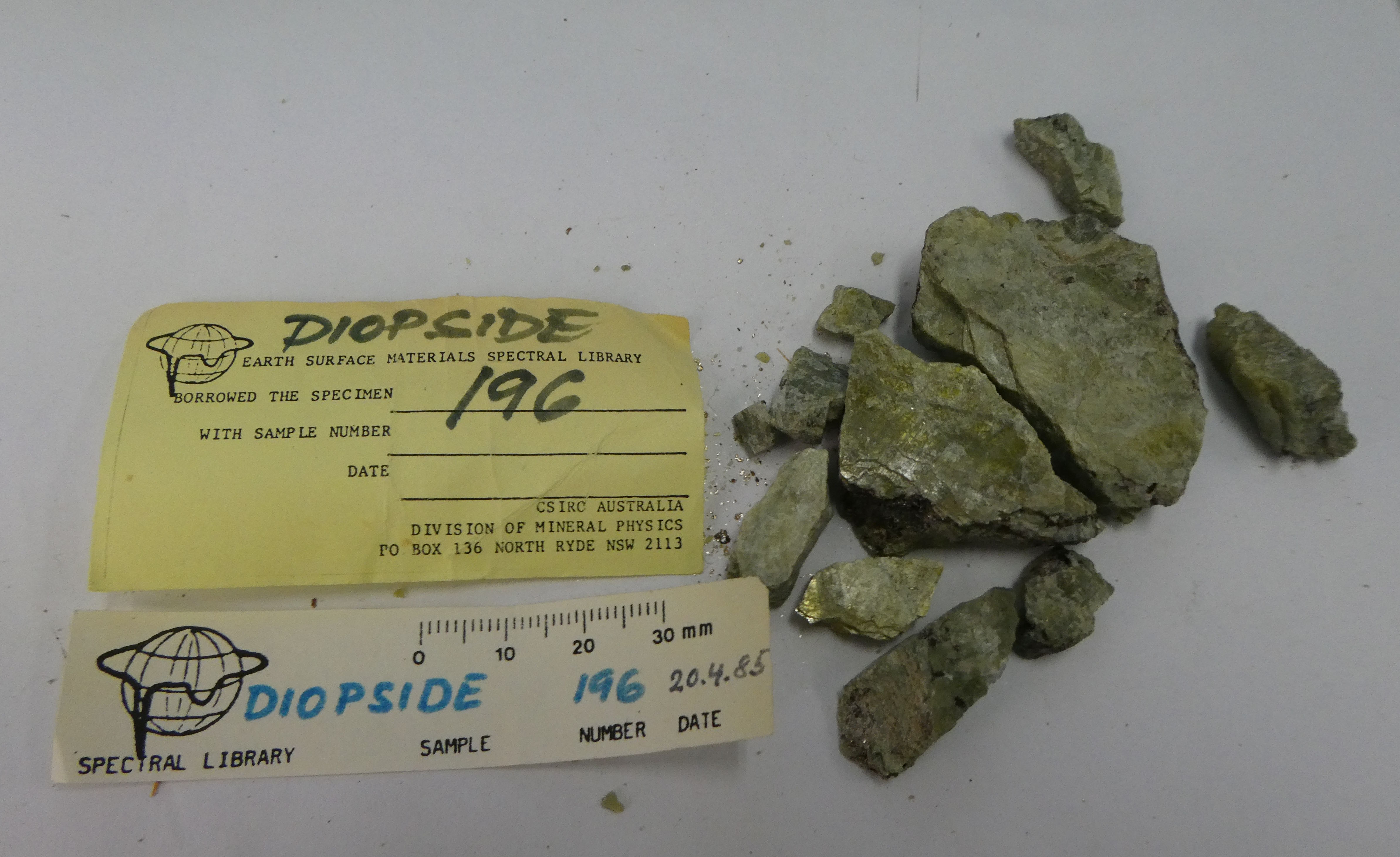 Image of Albite (var. Ca), Ankerite, Augite, Forsterite (var. Fe), Ilmenite, Montmorillonite and Sanidine in specimen 'M0834 Albite / Augite / Sanidine' [CSIRO].