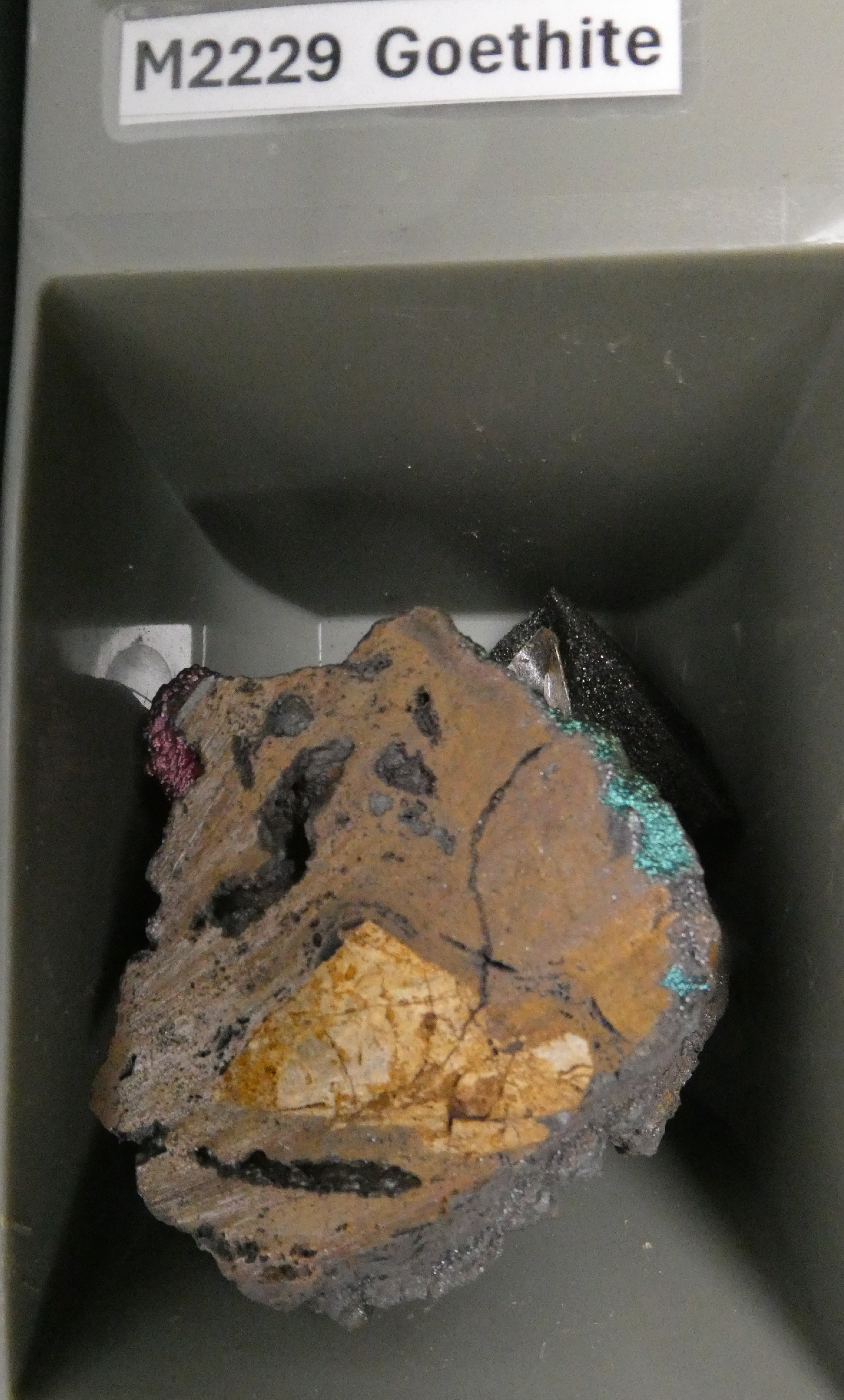 Image of Goethite, Clinochlore (var. Fe), Cuprite, Fluorite, Hematite, Malachite and Quartz in specimen 'M0656 Goethite / Cuprite' [CSIRO].