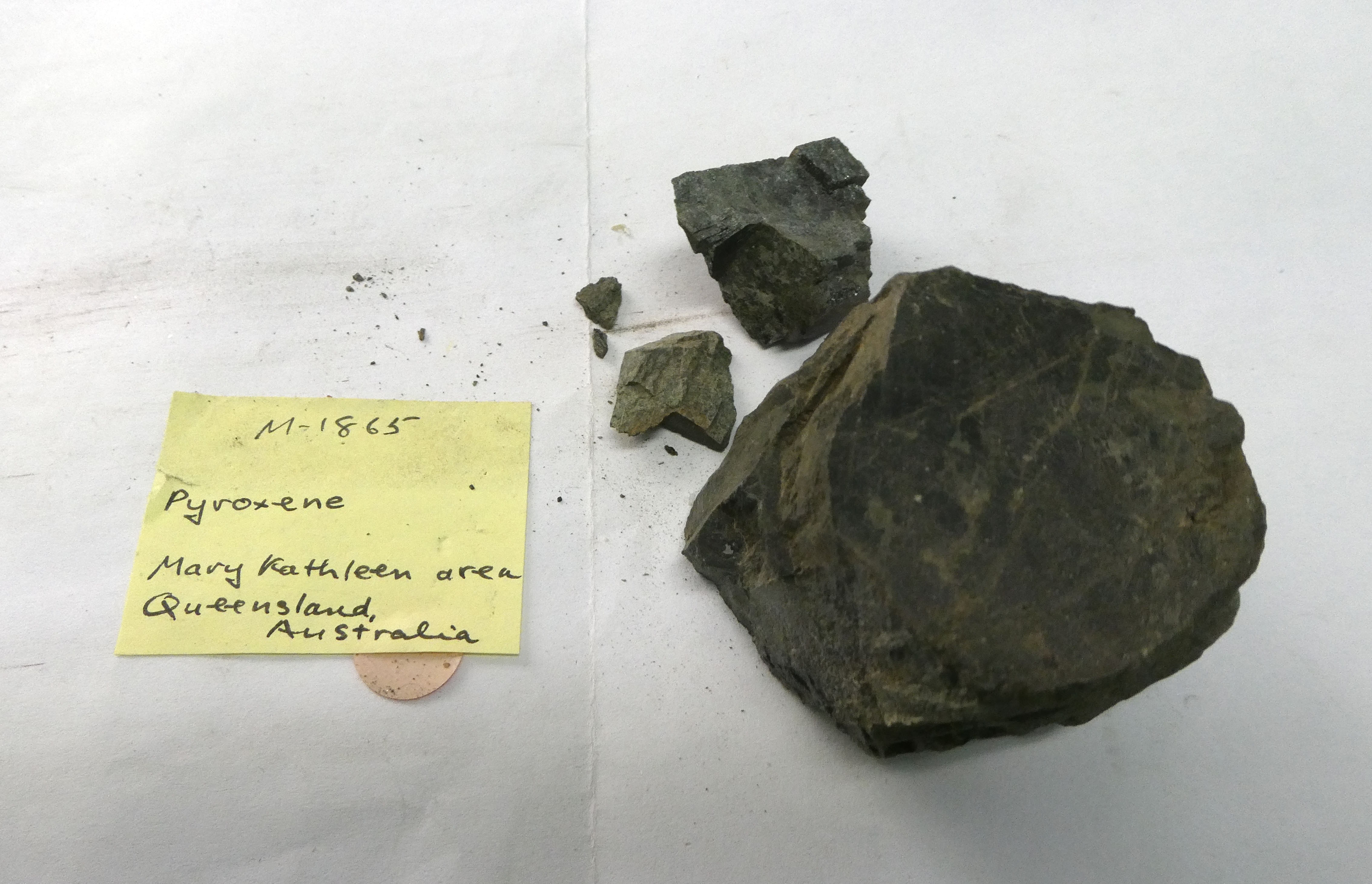 Image of Labradorite, Augite, Diopside (var. Fe2+), Lizardite, Nontronite-15.6A, Quartz, Rhodonite and Tremolite in specimen 'MT8397 Labradorite / Diopside' [CSIRO].