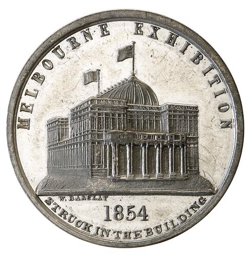 A tin medal (38 mm diameter) featuring a view of the front and side of the building with two flags flying, around above, MELBOURNE EXHIBITION; in exergue, 1854 / STRUCK IN THE BUILDING; the artist's name, W, BARKLEY is in small letters at the top left of