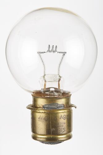 26 Volt, 240 Watt, gas-filled, coiled-coil tungsten filament, electric lamp. made by Siemens Brothers Ltd, England. Museums Victoria Collection item ST 29243